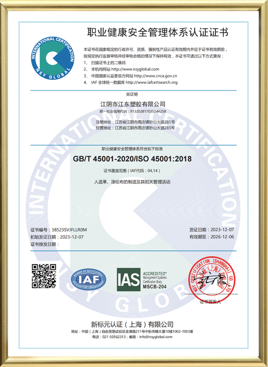شهادة - Jiangyin Jiangdong Plastic Co., Ltd