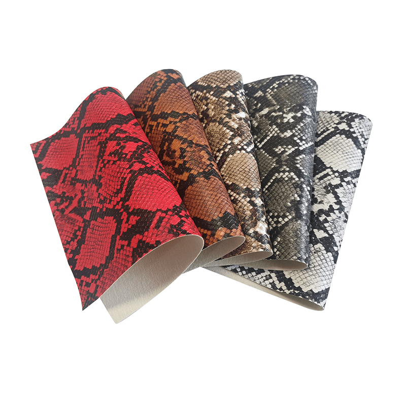يتكون الجلد الاصطناعي المطبوع نمط الأفعى في المقام الأول من كلوريد البولي فينيل (PVC) ، وهي مادة اصطناعية متعددة الاستخدامات ودائمة. يوفر PVC أساسًا قويًا للجلد الاصطناعي ، مما يضمن أن يتمكن من تحمل الاستخدام اليومي والحفاظ على مظهره الأنيق.